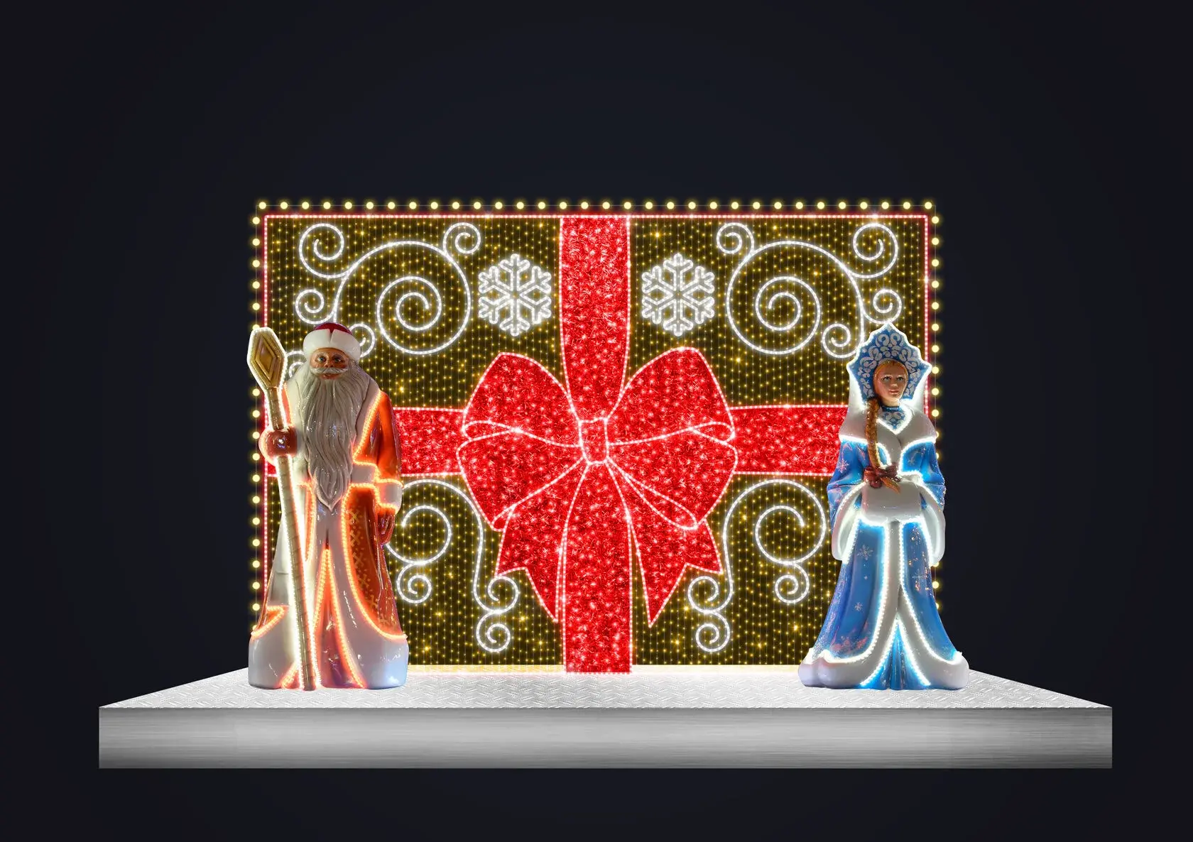 композиция фигур светящихся "Дед Мороз и Снегурочка" и панно с елками