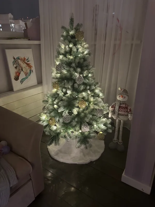 Иголки у ели отлиты из полимера, а потому приятны на ощупь, отлично сохраняют форму и цвет. Установка елочки не займет много времени, а металлический остов и надежная подставка помогут дереву выдерживать вес украшений. Использованные материалы безопасны в экологическом и пожарном отношении.