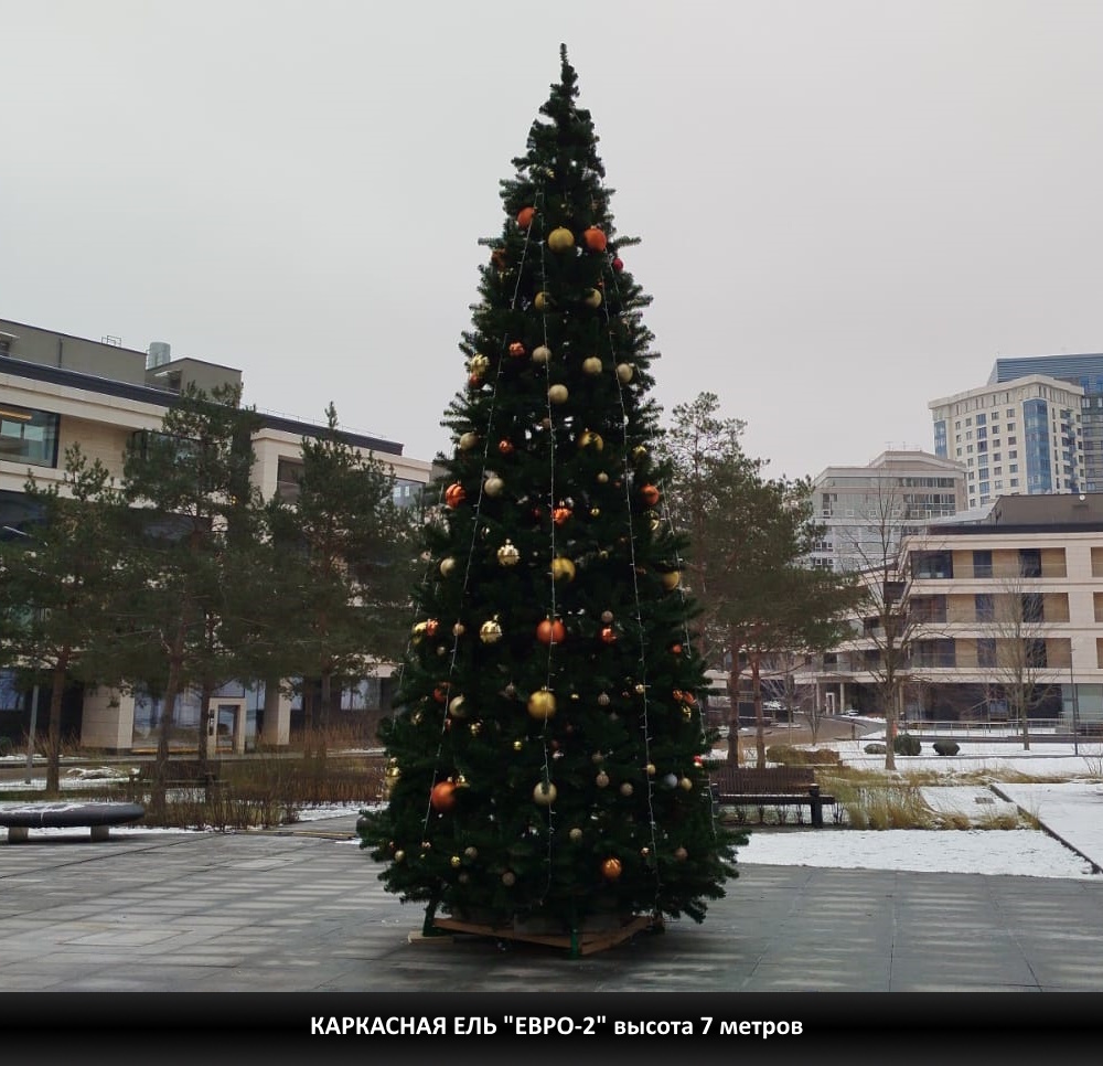 Каркасная уличная ель "Евро 2" - изготавливается в виде конусообразного металлического каркаса с зауженным диаметром. По периметру каркаса устанавливаются кольцевые ярусы для крепления хвойных веток. Хвоя покрывает всю площадь поверхности от макушки до основания. Елка устойчива к порывам ветра и непогоде.