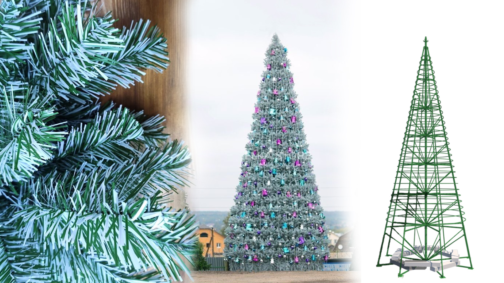 Каркасная уличная ель "Уральская изумрудная" - изготавливается в виде конусообразного металлического каркаса по периметру которого устанавливаются кольцевые ярусы для крепления хвойных веток. Хвоя покрывает всю площадь поверхности от макушки до основания. Каркасные елки наиболее устойчивы к порывам ветра и непогоде.