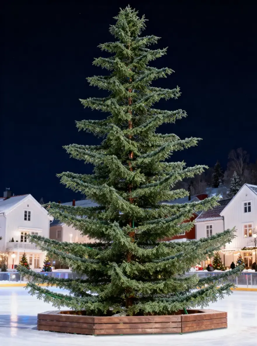 - Каркас представляет собой сборно-разборную конструкцию, окрашен порошковой краской зелёного цвета. Металлическое основание с диагональными ребрами жёсткости, центральный ствол, хвойная макушка, ветки с хвоей, лавочка