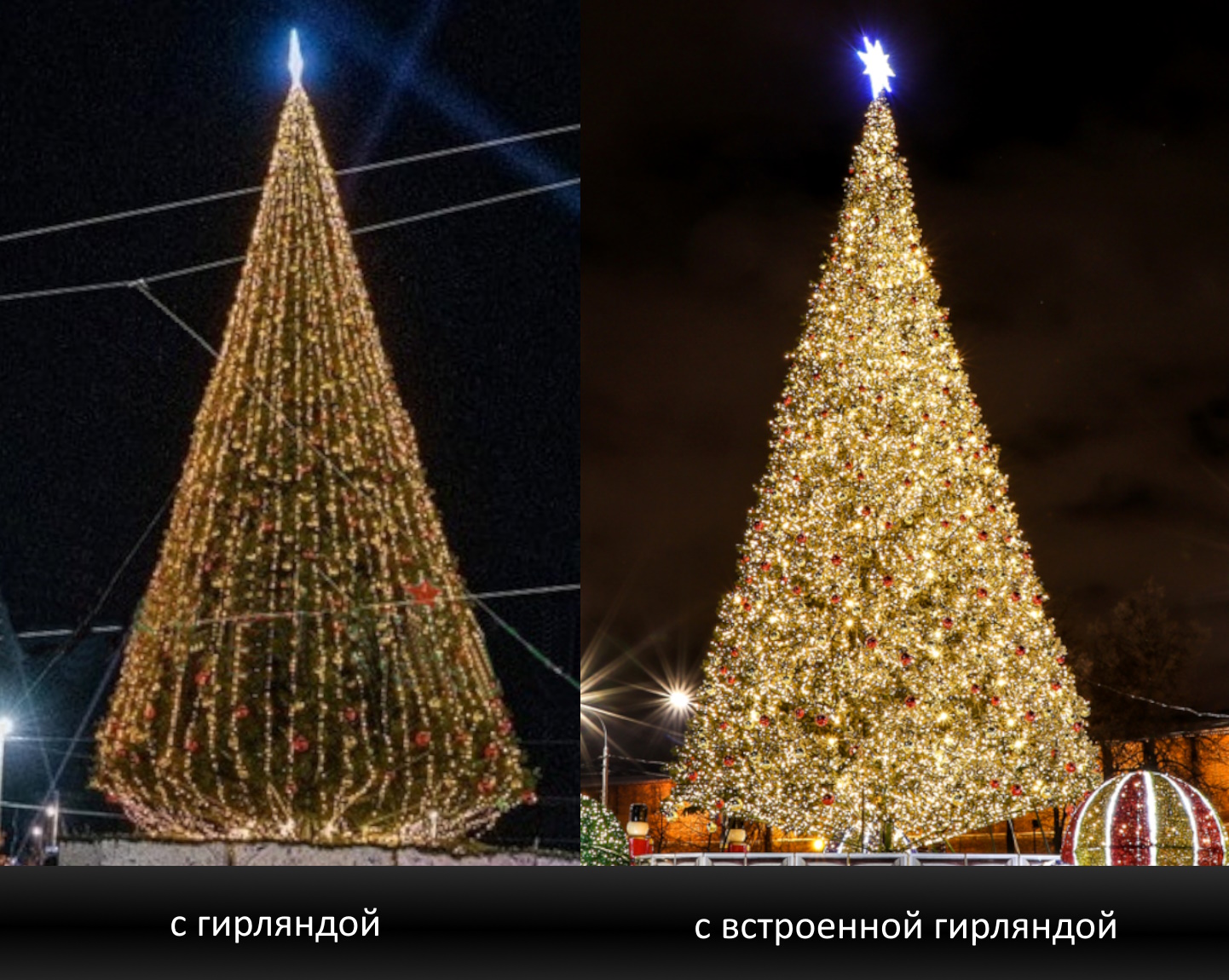 Светодинамическая елка - означает что в каждую ветку вплетена светодиодная гирлянда. Встроенное освещение обеспечивает максимальную незаметность проводов и равномерное свечение на елке, чего не добиться вручную. Светотехника разработана для эксплуатации в условиях Русской Зимы. Динамика освещения уличной световой елки создается специальным микропроцессорным контроллером. Теперь не нужно наряжать елку гирляндами, на производстве сделали это за вас. Елка выглядит красиво, словно из сказки. Иллюминация гирлянд принесет приятные эмоции в новогоднюю атмосферу.