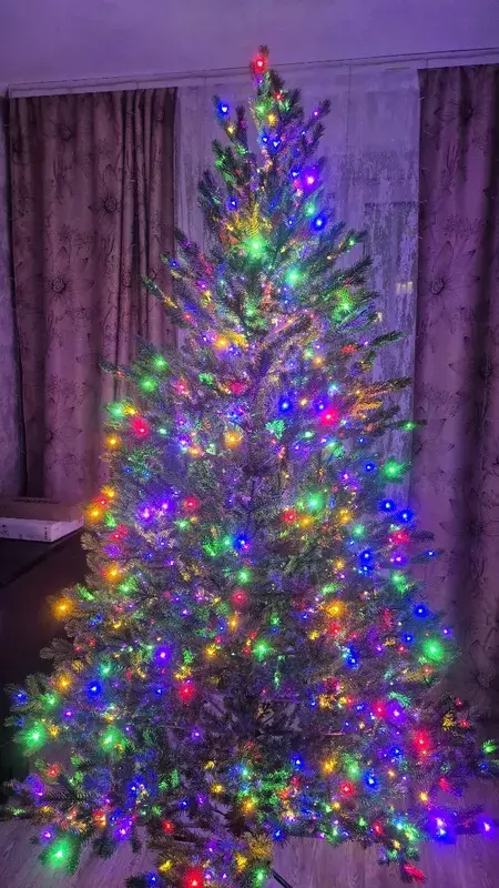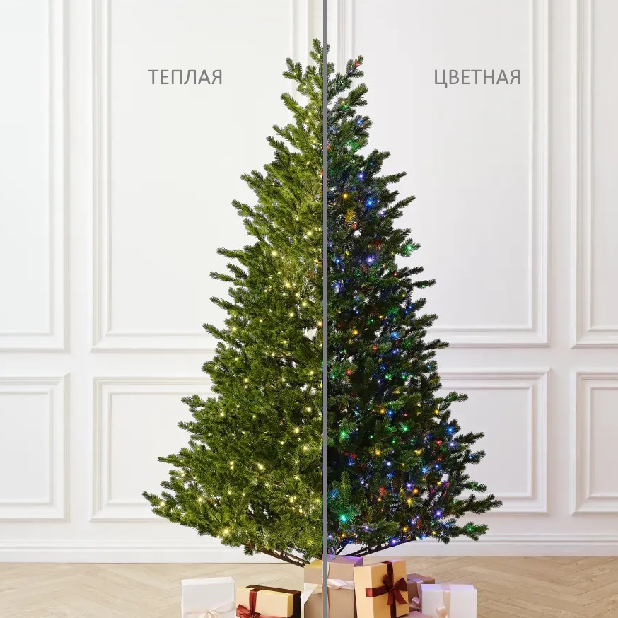 Отличительной чертой этой елки является наличие встроенной гирлянды 2в1. Она предлагает возможность выбора между теплым светом и яркими цветными лампочками. Более того, гирлянда оснащена различными режимами мерцания, которые можно легко переключать, что дает возможность адаптировать освещение в соответствии с вашим настроением или стилем праздника. Эта елка станет не только центром новогоднего декора, но и создаст атмосферу уюта и волшебства в вашем доме.