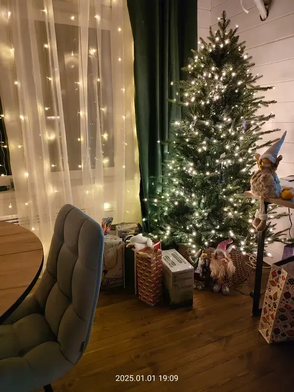 Одной из главных особенностей модели является встроенная LED-подсветка тёплого свечения. Светодиоды заранее закреплены на каждой ветке, создавая уютный и волшебный свет. Гирлянда подключается через специальные коннекторы, что позволяет быстро собрать ёлку.