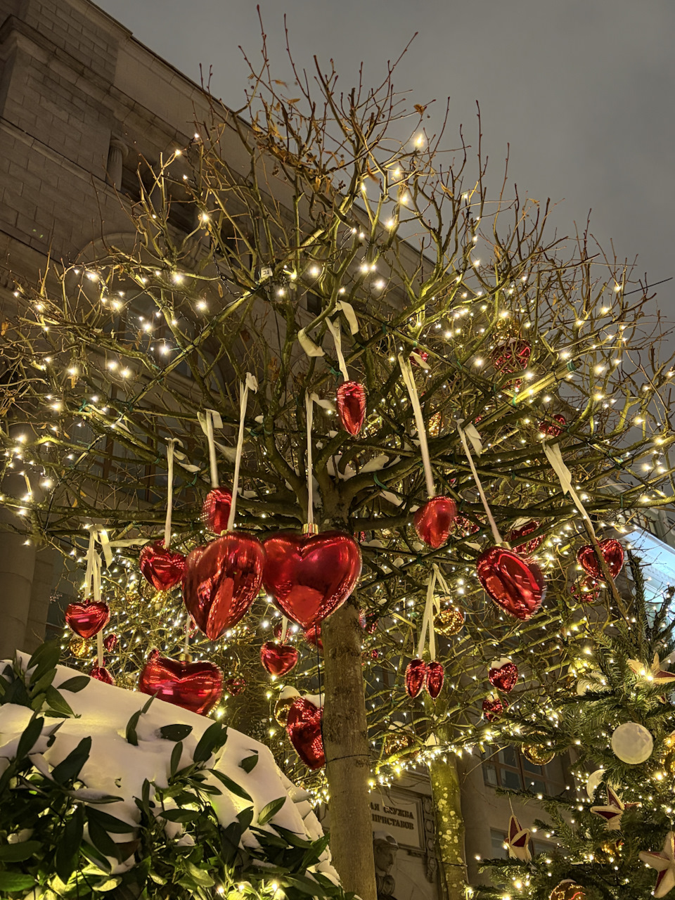 Игрушками украшают не только елку, но и деревья. Территория преображается и дарит приятные эмоции.