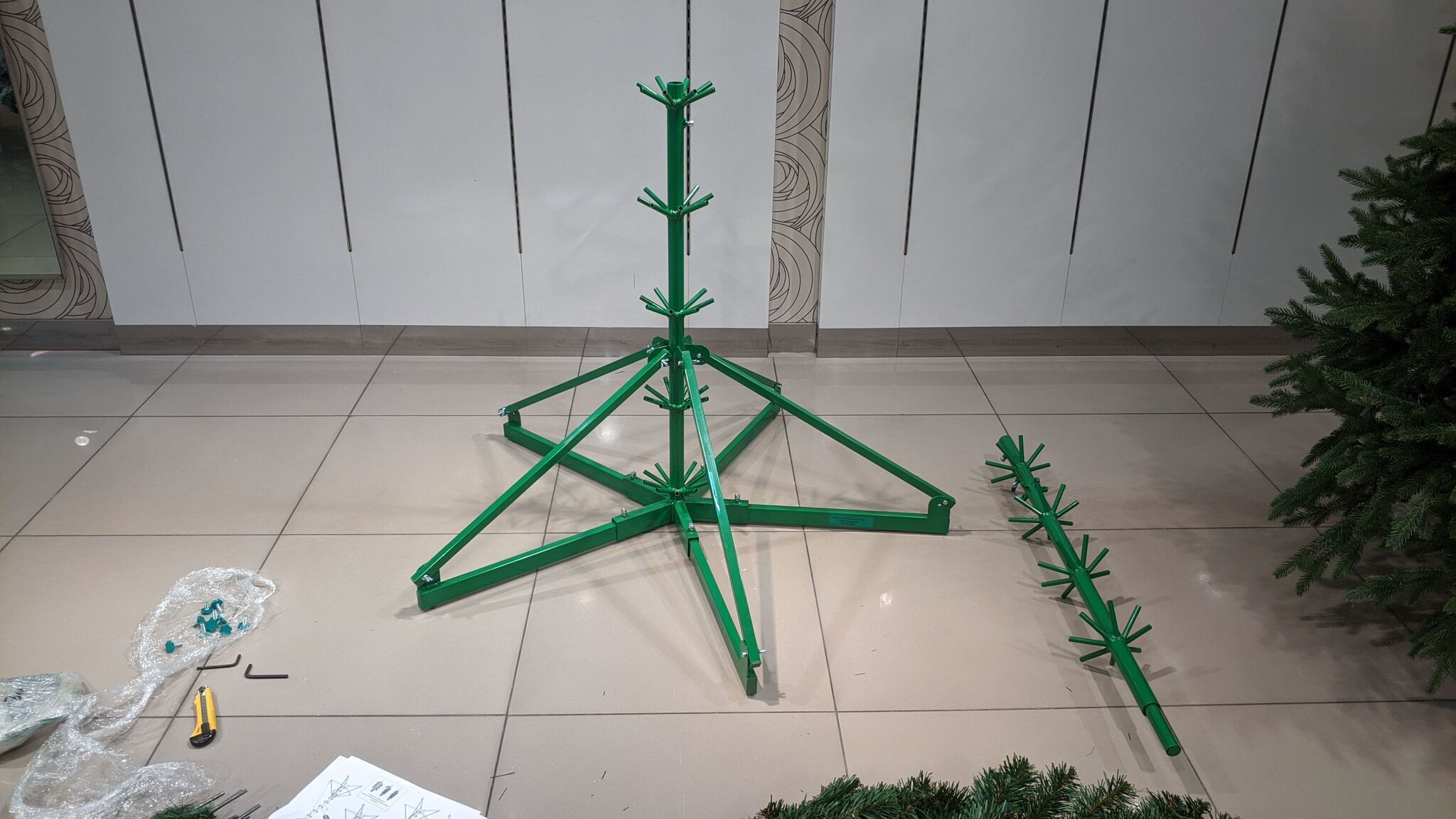 Искусственная большая сосна «Рублевская». Ель можно устанавливать на улице и в общественных помещениях. Имеет высокую прочность, разборную конструкцию, экологичность, удобство сборки и разборки. Каркас из несущего стального ствола и подставки, который обеспечивает устойчивость и долговечность. Ветки вставляются в специальные пазы на стволе. Материал веток изготавливается из плёнки ПВХ или из лески. Подходит для установки в детских садах, школах, актовых залах, культурных учреждениях и других помещениях.