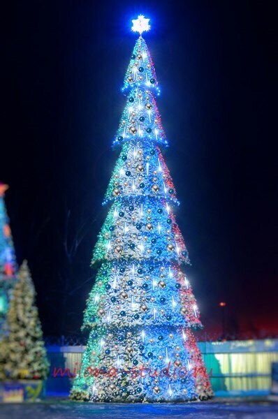 Уличная Сегментная елка - это елка каркасной конструкции, состоящая из сегментов разного диаметра. В готовом виде сегментная ель выглядит как многоярусная конусная конструкция, в которой каждый выше расположенный ярус меньше нижнего. Каркас изготовлен из прочного металла и устойчив к порывам ветра и непогоде. Основание елки покрыто ветками, поэтому елка может устанавливаться без ограждения.