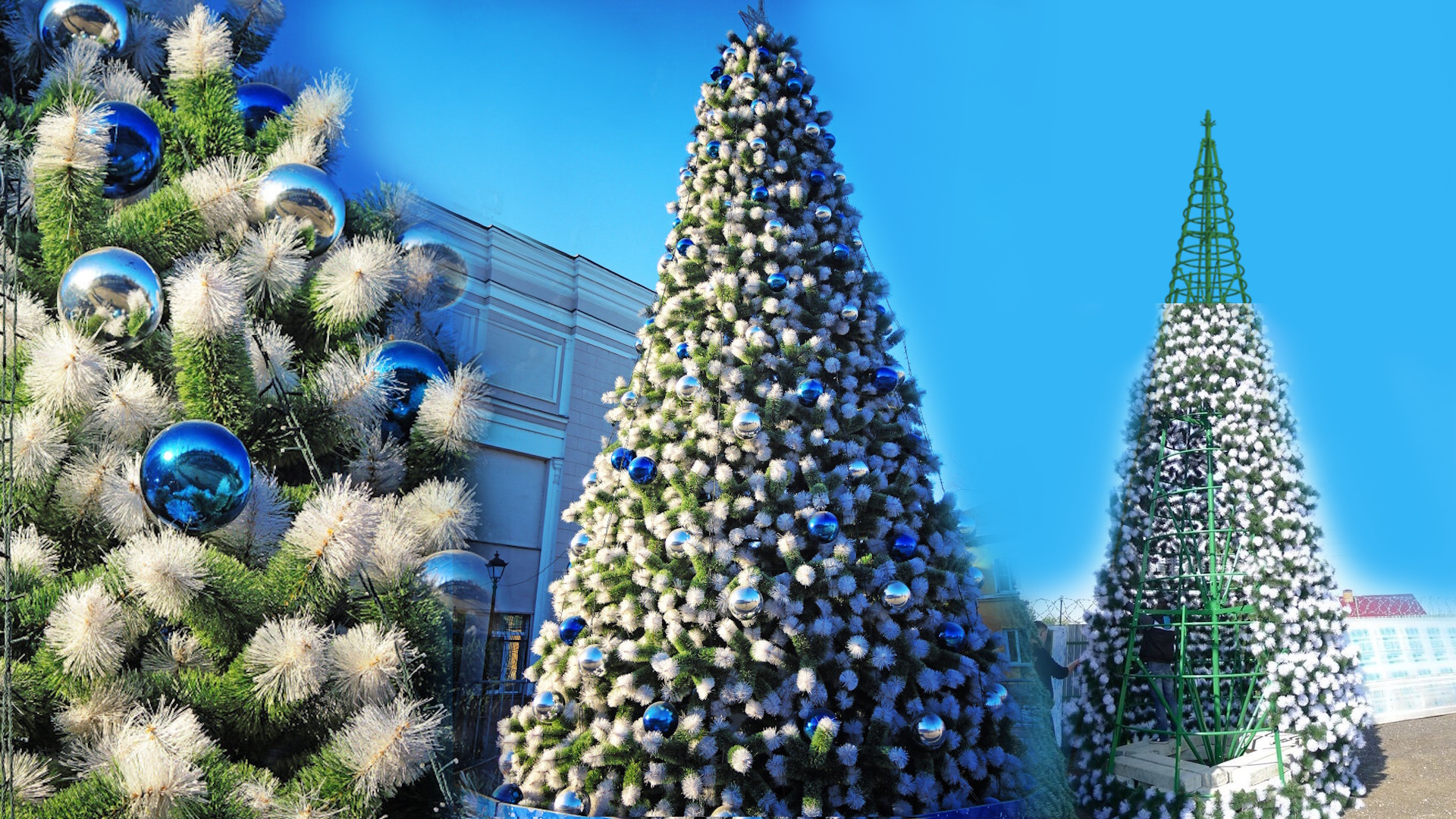 Каркасная уличная "Уральская сосна бело-зеленая" - изготавливается в виде конусообразного металлического каркаса по периметру которого устанавливаются кольцевые ярусы для крепления хвойных веток. Хвоя покрывает всю площадь поверхности от макушки до основания. Каркасные елки наиболее устойчивы к порывам ветра и непогоде.