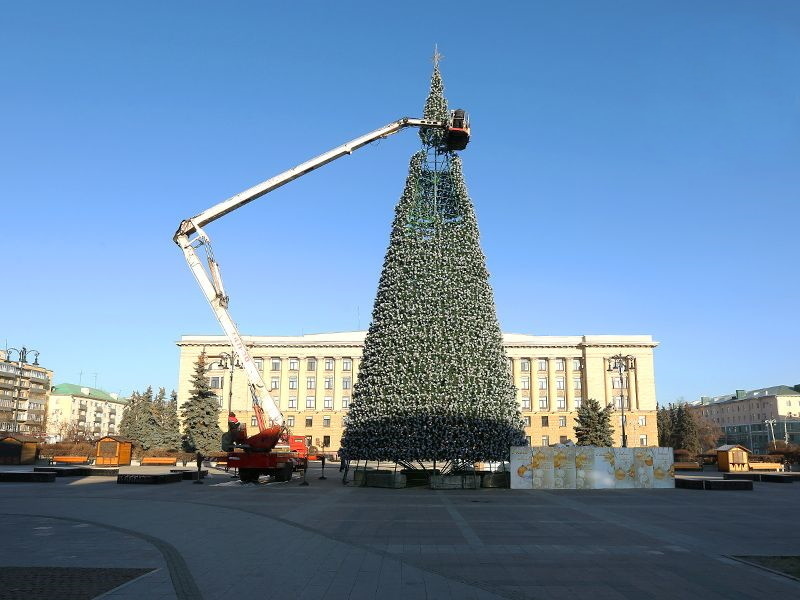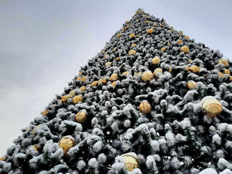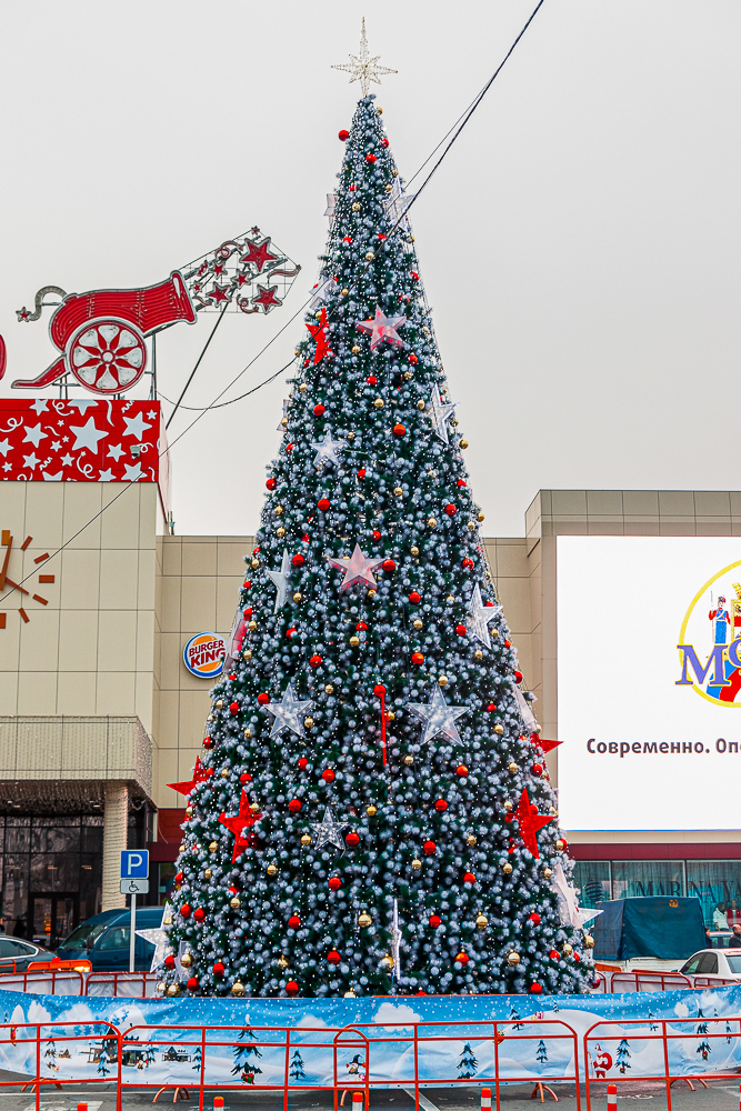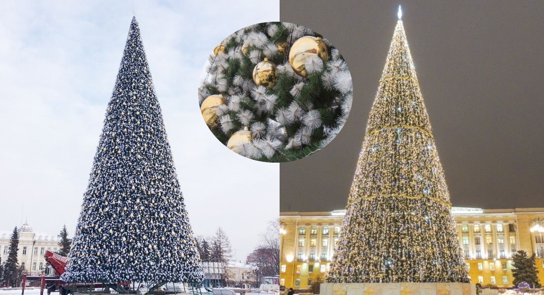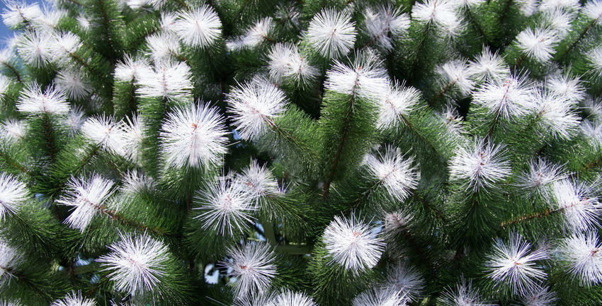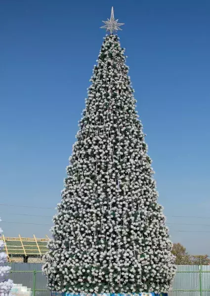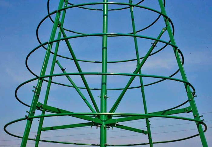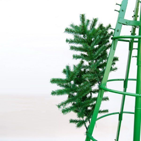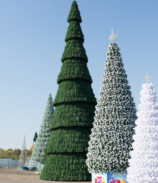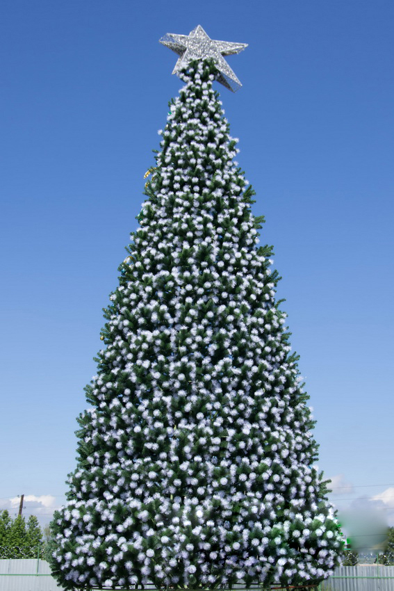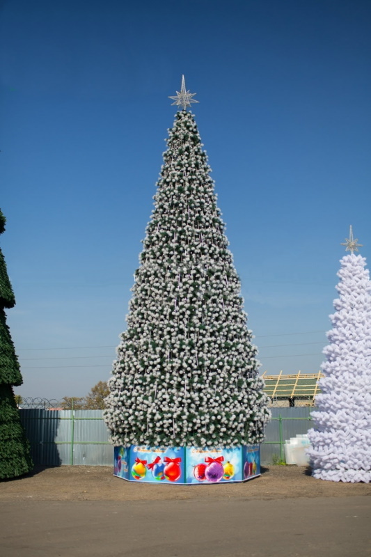 Каркасная уличная "Уральская сосна бело-зеленая" - изготавливается в виде конусообразного металлического каркаса по периметру которого устанавливаются кольцевые ярусы для крепления хвойных веток. Хвоя покрывает всю площадь поверхности от макушки до основания. Каркасные елки наиболее устойчивы к порывам ветра и непогоде.