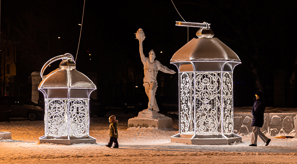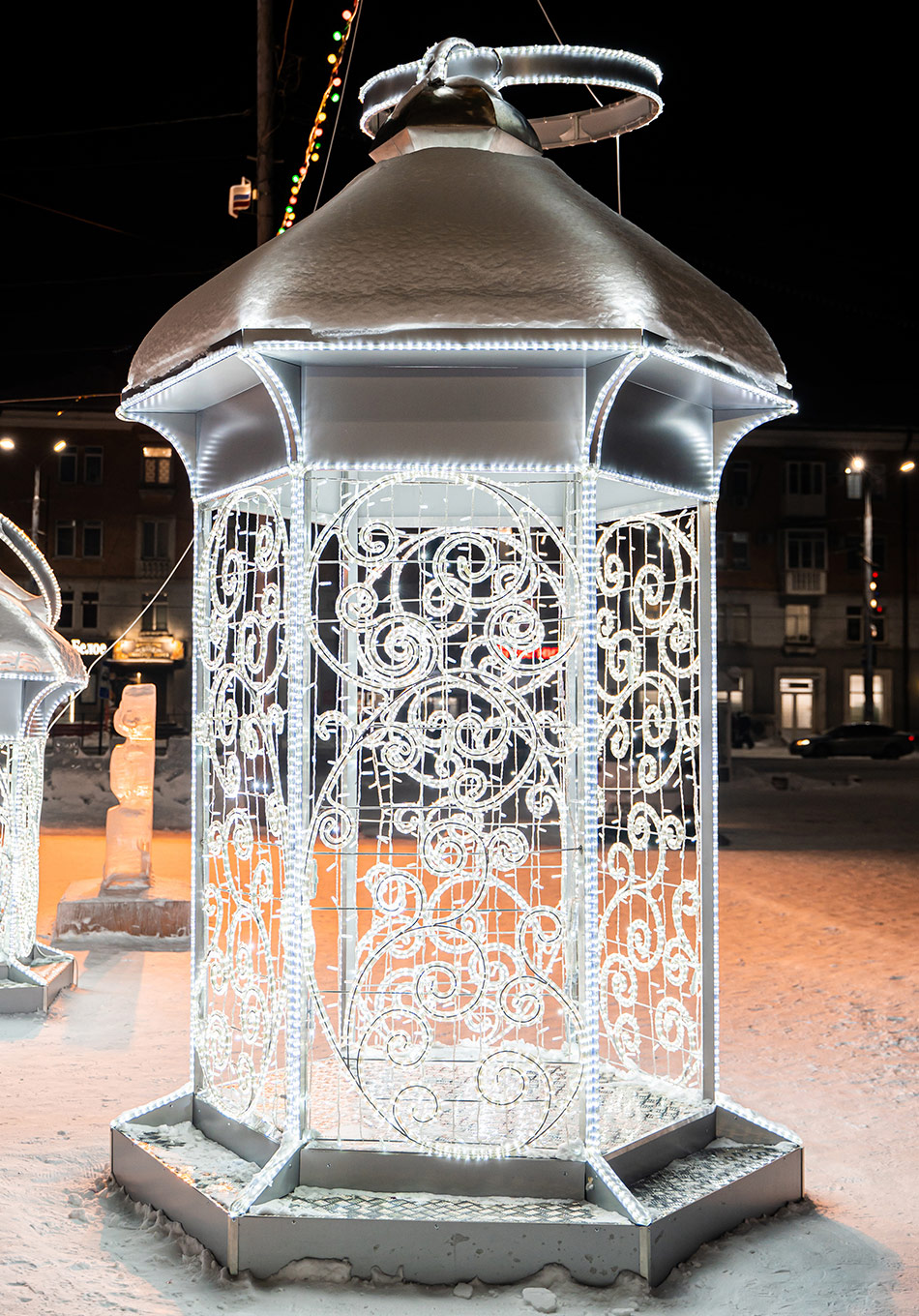 Уличная иллюминация со степенью защиты, не боится осадков. Каркас сварен из металлического сплава, он не ржавеет и хорошо блестит на солнце. Это позволяет использовать иллюминацию в любую погоду круглый год. Такая конструкция украсит улицы городов, привлечет внимание взрослых и детей и станет объектом для фотосессий.