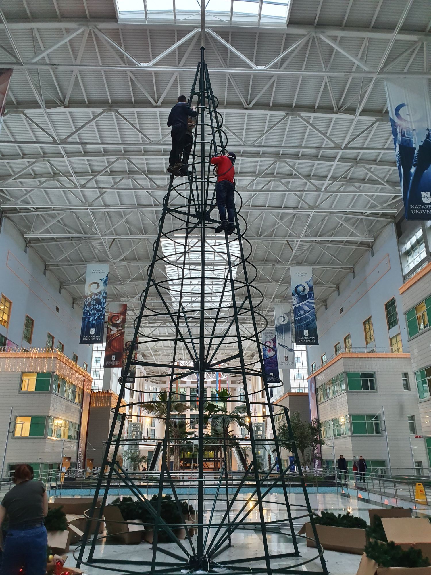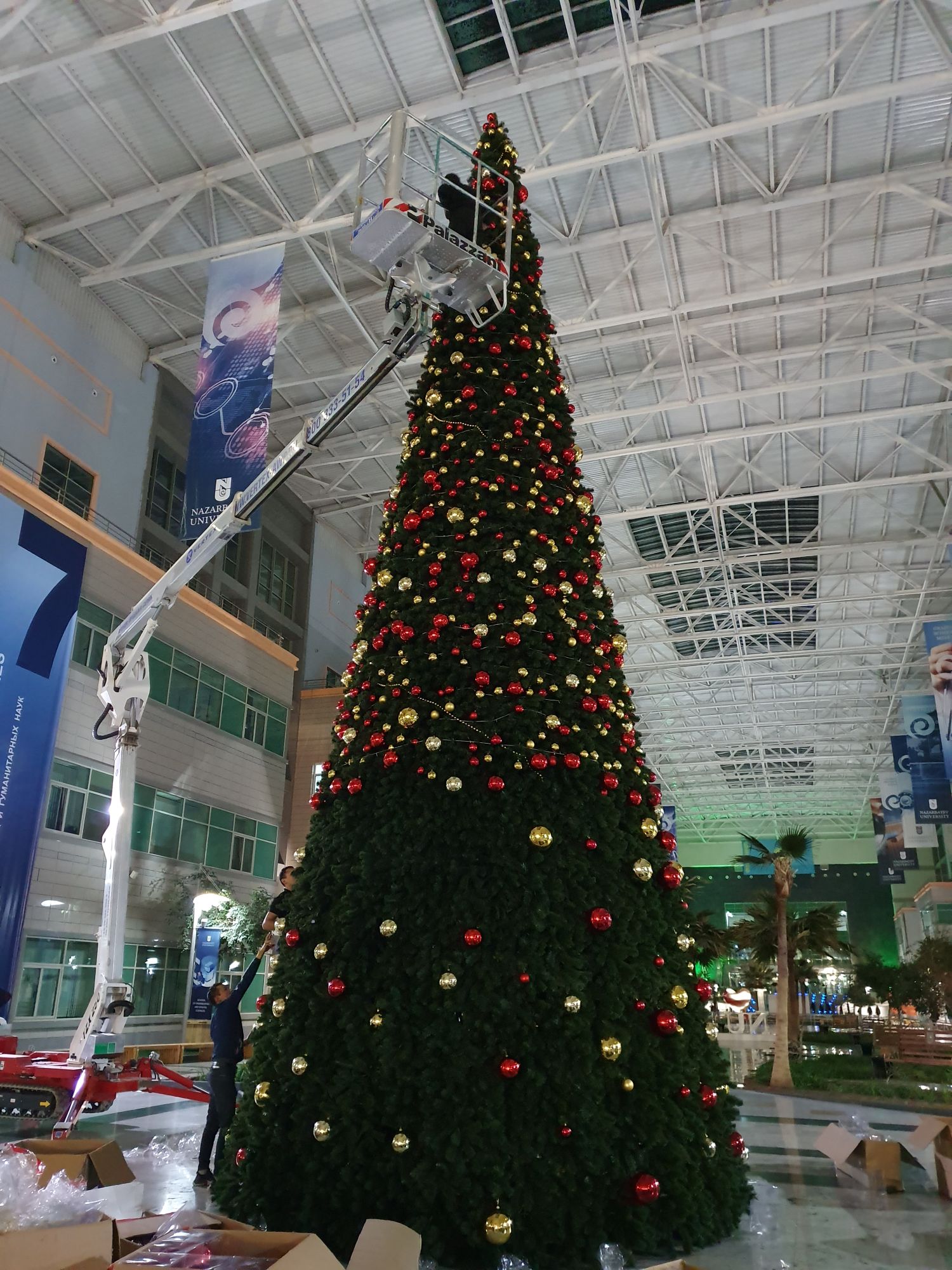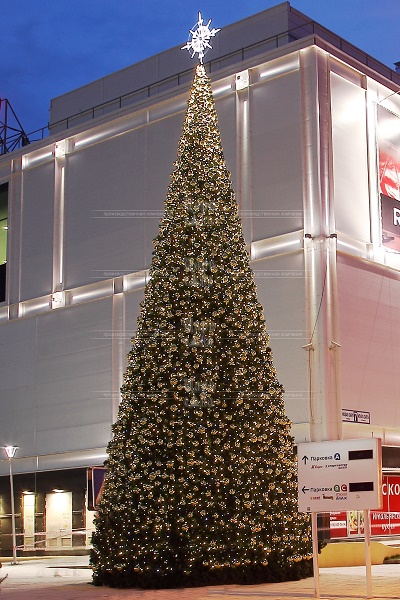 В качестве основного материала использован 4-слойный пигментированный поливинихлорид (пвх). Именно многослойность помогла создать объемные иголки, и в результате – пышные лапы со сложной геометрией, практически, точным повторением природной формы. Этот же материал с успехом противостоит возгоранию и горению, а потому изделие прошло противопожарную экспертизу.