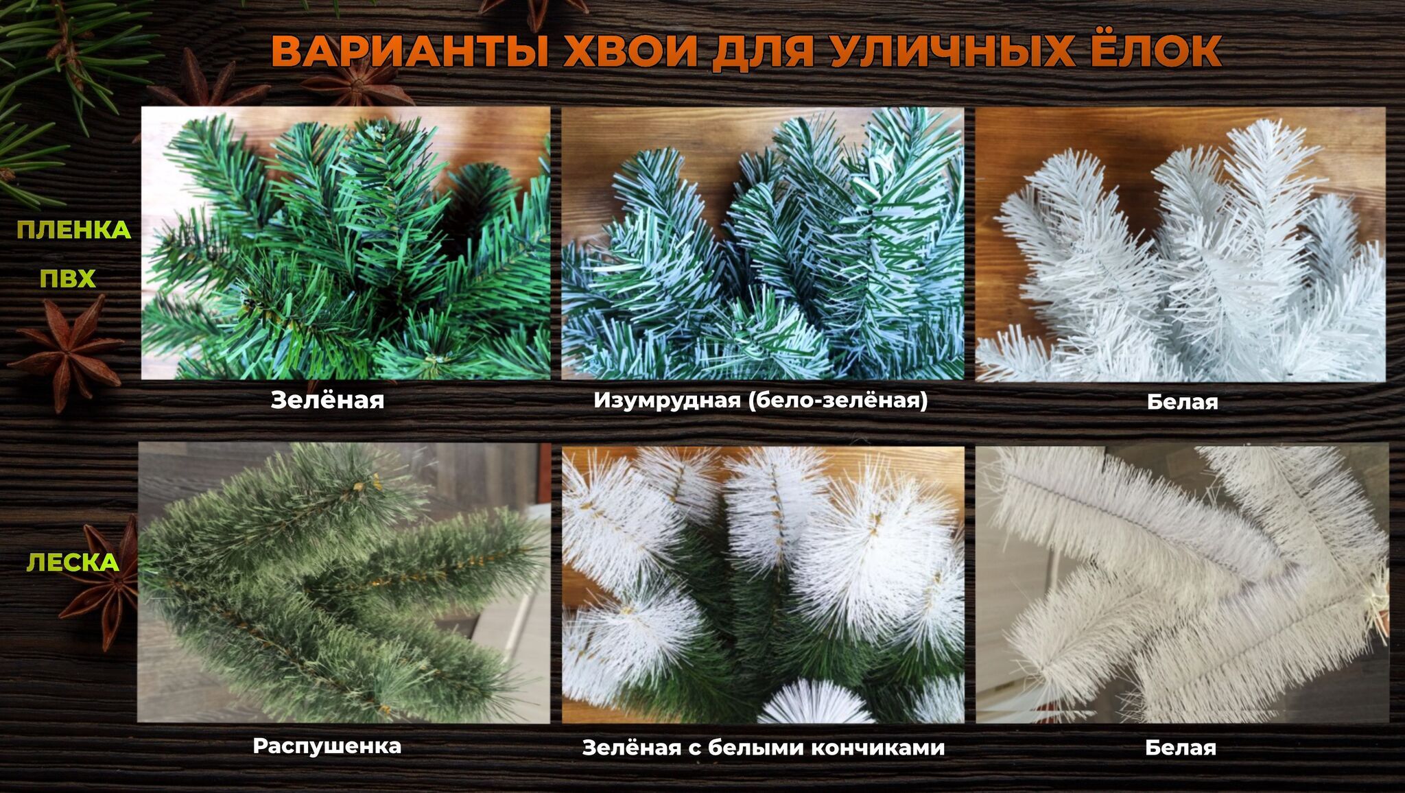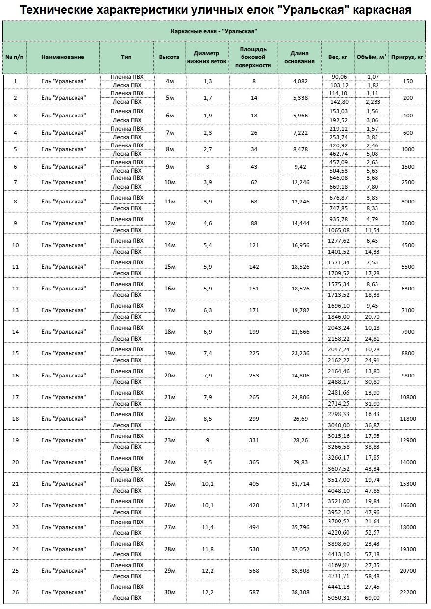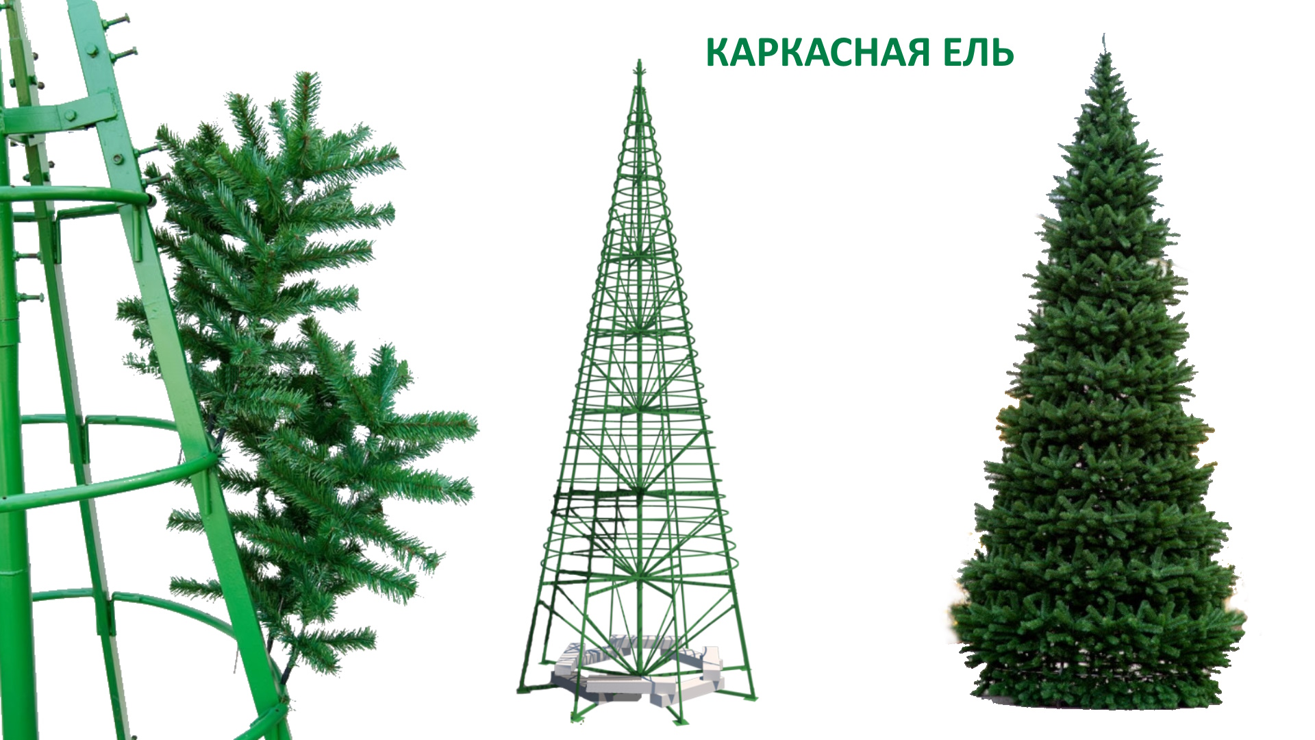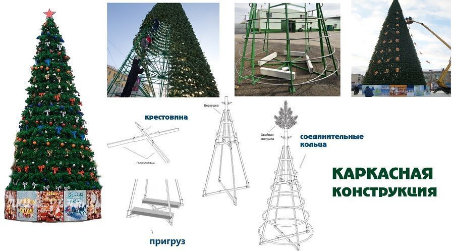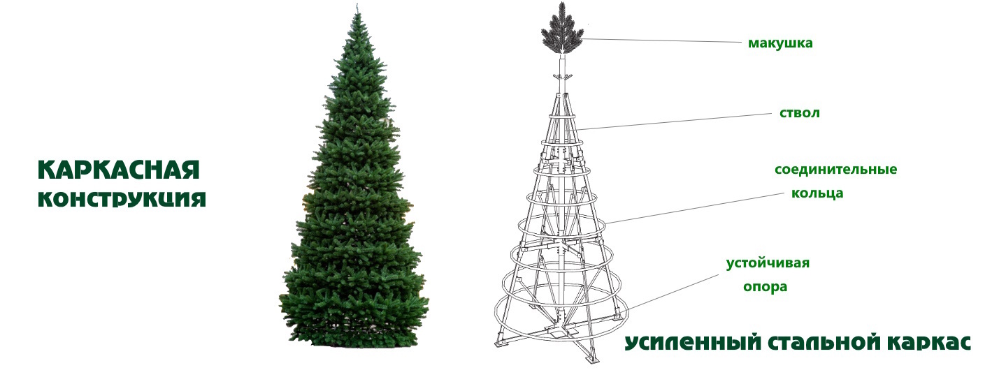 Каркасная уличная ель "Уральская" - изготавливается в виде конусообразного металлического каркаса по периметру которого устанавливаются кольцевые ярусы для крепления хвойных веток. Хвоя покрывает всю площадь поверхности от макушки до основания. Каркасные елки наиболее устойчивы к порывам ветра и непогоде.