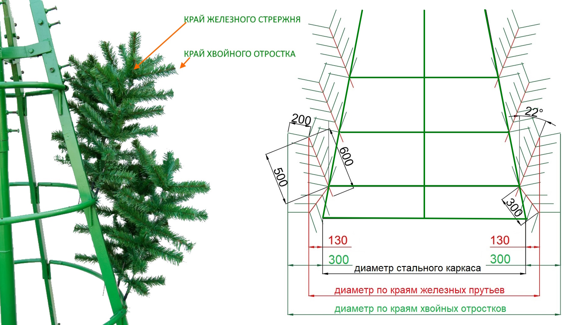 2 - считаем по краям хвойных отростков, то + 60 см к диаметру каркаса